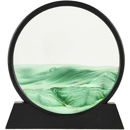 DESCRIPCIÓN:El movimiento relajante de la arena puede aliviar el estrés, relajar tus ojos, cultivar la paciencia. Mira las montañas y valles que se forman delante de tus ojos. Cada vez que gires la imagen dinámica de arena, obtendrás una imagen diferente. Mirando la arena que cae y las escenas cambiantes del paisaje, te sentirás especialmente tranquilo y relajadoCon el marco y el vidrio da la mejor vista de la belleza. Ideal para sala de estar, decoración de dormitorio y hogar o como un regalo perfecto para tu amigo y para ti mismo. También es un regalo perfecto para bodas y festivales.CARACTERÍSTICAS: Material: Vidrio, silicona y plastico ABSColores de arena: Verde.Color de marco: Solo negro Presentación en cajaEl paquete incluye 1 adorno + su base.Manual en inglés en la parte posterior de la cajaListo para usar solo girarlo en sentido opuesto y la arena empezara a caer.Si necesita de mas burbujas o menos leer el manual.Único tamaño medidas en fotos.La antepenúltima foto y color real del producto.Para recalcar no es un reloj de arena su función lo hace parecer, pero es un adorno nada mas.GARANTÍA PARA CAMBIO/ DEVOLUCIÓN:Hasta 7 días después de recibido el producto, debe contar con el empaque original en buen estado y accesorios completos, no debe presentar señales de uso o deterioro, de no cumplir con lo solicitado no procederá el cambio o devolución del producto.