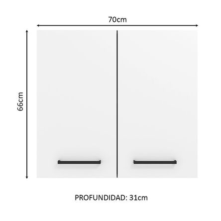 Este es el armario de pared de 70 cm con dos puertas de la línea Agata de Madesa. Muy moderno, destaca también por el gran espacio interior disponible. Dividido por un estante, es perfecto para organizar los utensilios de cocina.Fabricado con materiales de alta calidad, tiene tiradores con tiradores de aluminio y bisagras con amortiguación, que proporcionan un cierre suave de las puertas.El armario está acabado en blanco, con 7 capas de pintura de poliéster que lo protegen de los efectos del alcohol, el agua y el calor.Este armario se puede combinar con otros módulos y con todas las cocinas de la línea Agata de Madesa.Medidas totales- 66 cm de alto- 70 cm de ancho- 31 cm de profundidadElementos incluidos:- Un (1) armario superior con dos (2) puertasObs:- Imágenes puramente ilustrativas. La decoración no se incluye con el producto.- Madesa no presta servicio de montaje. El producto viene con manual de instalación y todos los herrajes necesarios para su montaje.