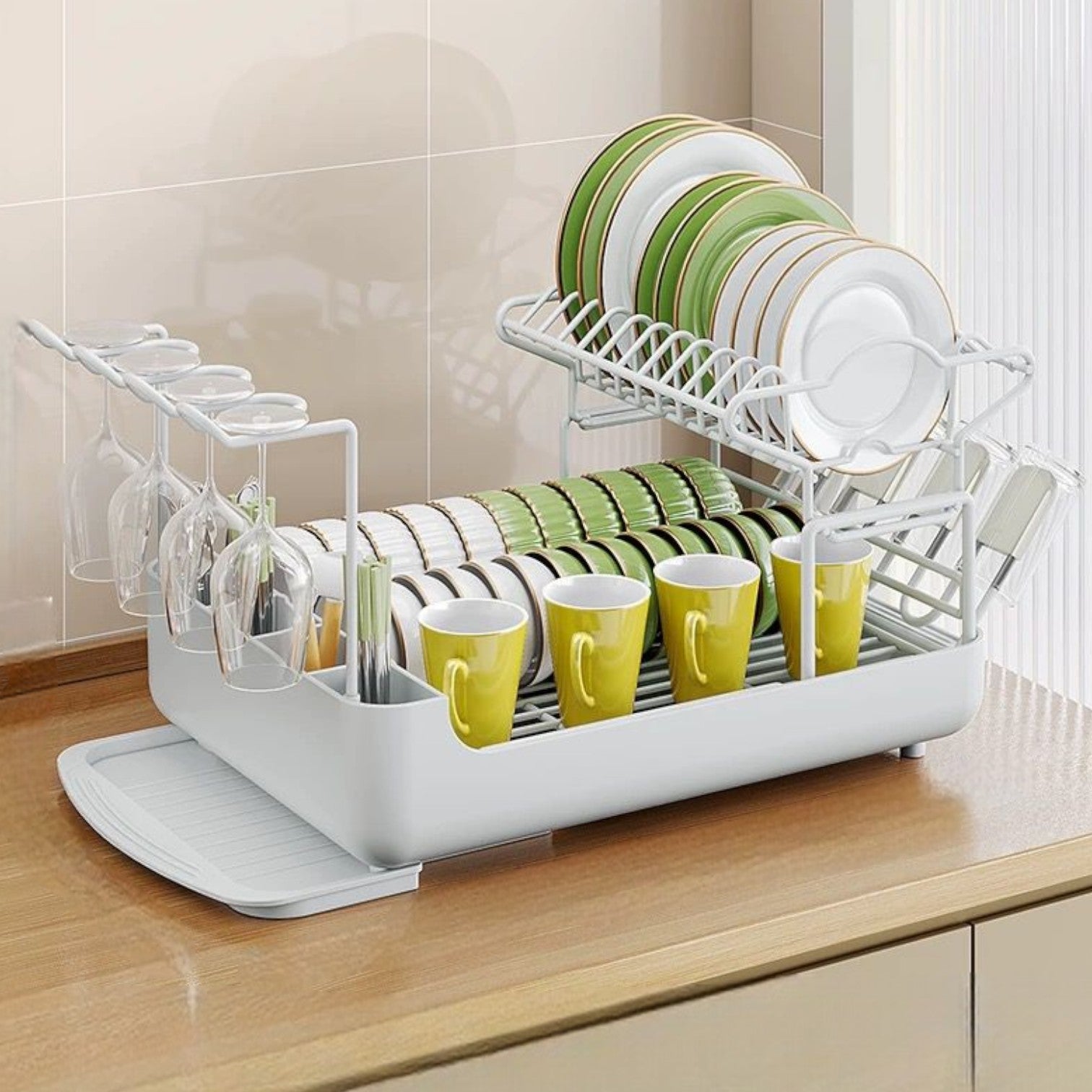 Recupera tu precioso espacio en la encimera y disfruta del doble de almacenamiento de este escurreplatos de 2 niveles. Dos niveles y compartimento de almacenamiento lateral inteligente. La bandeja inferior integrada atrapa el exceso de agua.