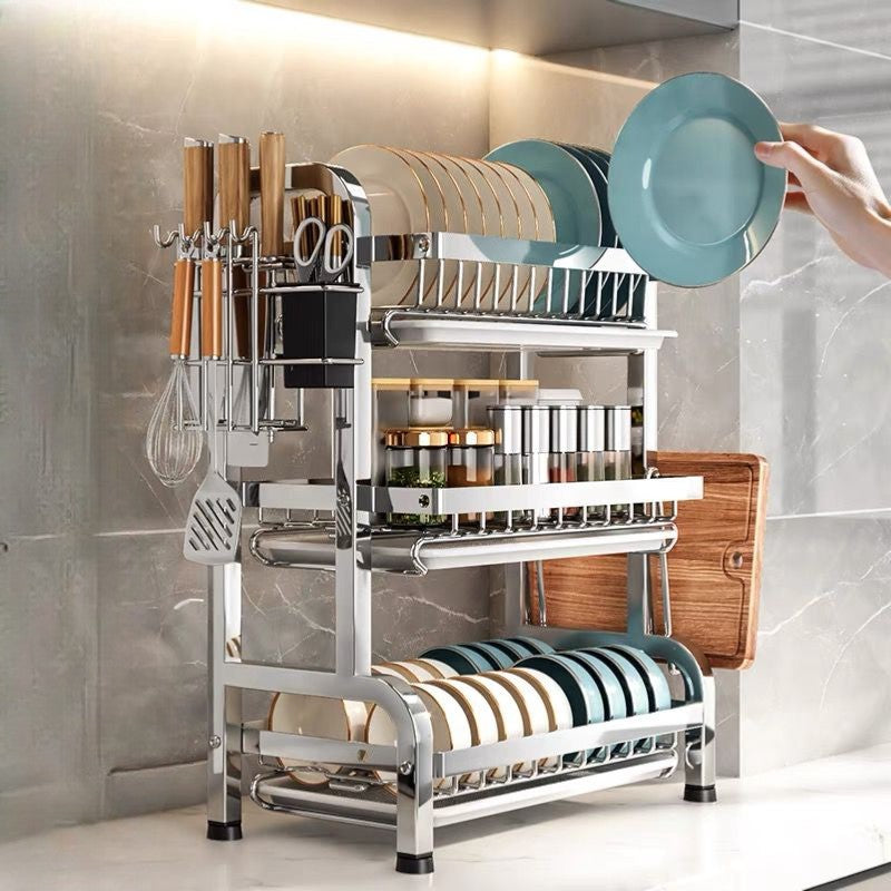 Cuenta con tres niveles principales, en donde se puede ordenar los distintos tipos de vajilla y vasos. Además, cuenta con accesorios laterales para organizar los cubiertos o utensilios adicionales. Cada nivel cuenta con su propia bandeja desmontable para que el agua escurrida se almacené ahí.—Precio: 220 soles—Material: Acero inoxidable—Medidas: 43 cm largo x 25 cm ancho x 58cm alto**—Colores: Plateado