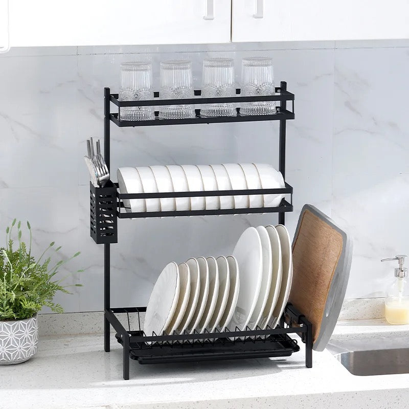Herramienta de cocina muy práctica, mantiene todos los utensilios de cocina ordenados, limpios y secos. Ahorro de espacio en la cocina: ofrece un montón de espacio para almacenar todos tus utensilios de cocina, haciendo que tu cocina esté más limpia y ordenada. Incluye recipiente escurridor de cubiertos, bandeja extraible Y Rack organizador de tabla de picar .—Precio: S/80—Medida: 42x25x60cm—Material: Cromado —Color: Negro