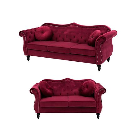 Añade un toque de elegancia a tu interior con este juego de sala. Está fabricado a partir de tela montreal de alta calidad. El respaldo y los reposabrazos de diseño capitoné aportan un toque de distinción a la pieza. El estilo retro combina bien con cualquier sala de estar u oficina en casa. Los cojines adicionales vienen con fundas extraíbles. Las patas de madera maciza garantizan estabilidad.