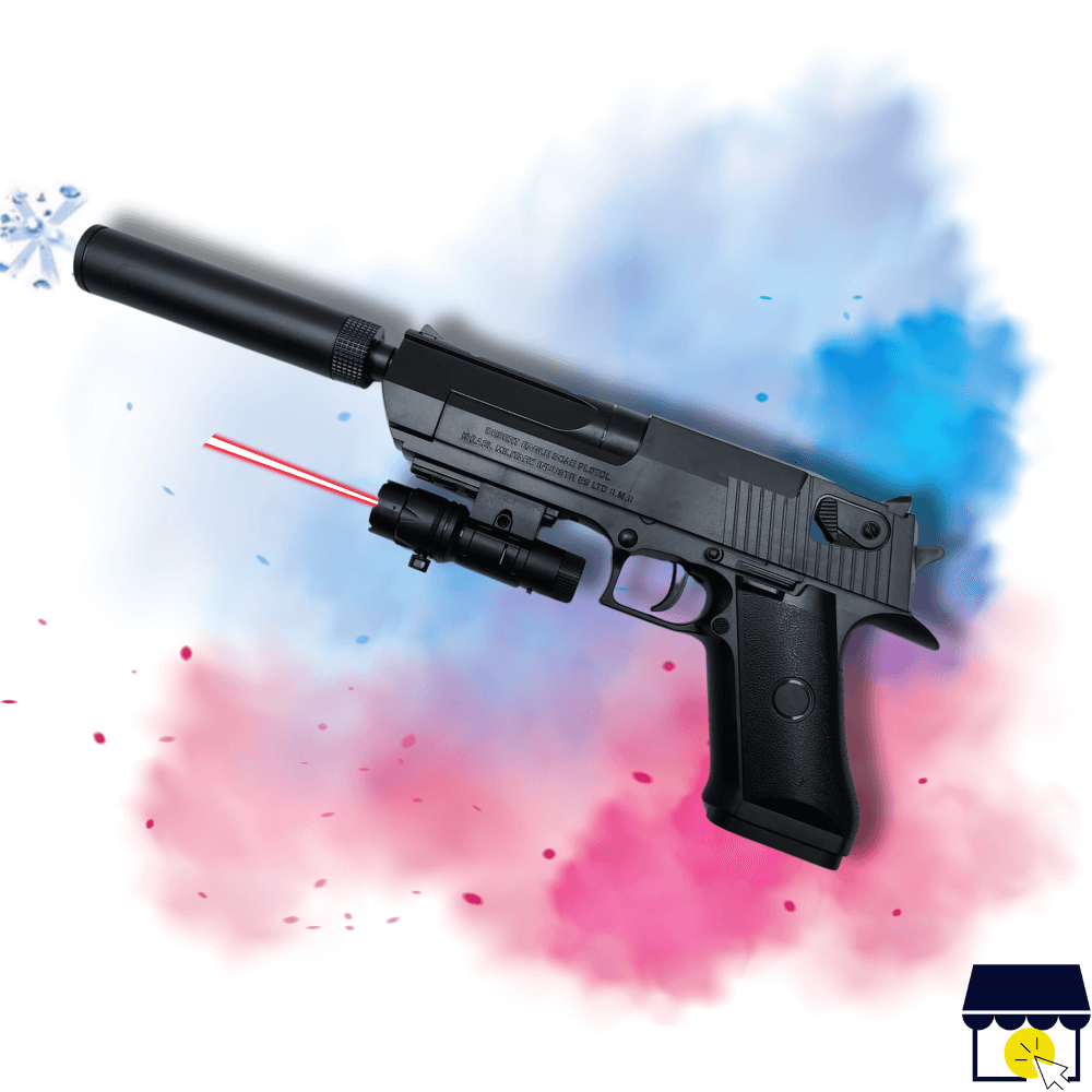 Accesorios incluidos: mira láser para mejor precisión, silenciador (accesorio) y gafas de protección.