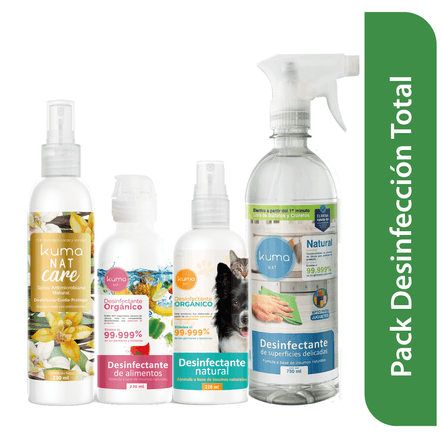 ¡Descubre la desinfeción natural para tus alimentos, superficies, manos y mascotas en un solo paquete de KUMA NAT! Sumérgete en la experiencia única de nuestra colección exclusiva de productos naturales, cuidadosamente seleccionados para ayudarte a eliminar los gérmenes y bacterias al 99.999%.¡Kuma Nat, cuidamos tu salud y la de tu familia!