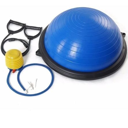 Balon Bosu, de material de alta resistencia, superficie anti deslizante, con manillas elásticas. Utilizado en una amplia gama de ejercicios debido a sus características, potenciando la fuerza, el equilibrio y mejorando la postura corporal. También se utiliza para ejercicio cardiovascular como complemento para trabajos aeróbicos. Además, por sus características polifuncionales, es utilizado en el área Fisioterapéutica. Medida 62x12x58