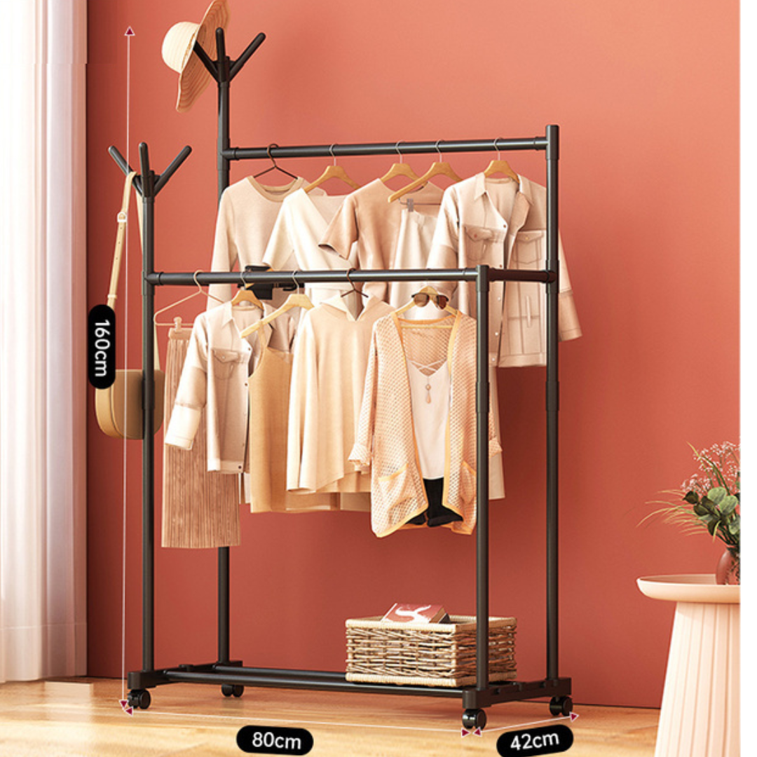 Almacenamiento de rejilla inferior que puede contener zapatos, cajas, etc. La barra de extensión lateral le permite colgar sombreros, bolsos, bufandas, corbatas, etc.