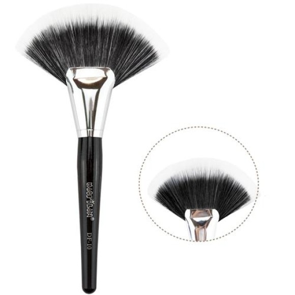 Cepillo abanico dúo fibra de dos fibras para aplicar productos líquidos, cremosos o en polvo. Ideal para eliminar residuos de sombras de la piel o para aplicar productos como iluminadores o polvos sueltos para dar acabado a la piel. Existen varias formas de utilizar una misma brocha, lo que hace más práctica la preparación y acabado de tu piel. Características: Brocha desarrollada para aplicar maquillaje líquido, cremoso o en polvo. Especificaciones técnicas: Contiene: 1 unidad. Tamaño del cepillo: 20 cm aproximadamente.Composición: Madera, Metal y Nylon.Cerdas: Sintéticas. Consejos de uso: Mantener la higiene del cepillo con productos adecuados, para que las cerdas queden siempre suaves y libres de hongos y bacterias Lavar siempre con jabón neutro y dejar secar en posición horizontal.