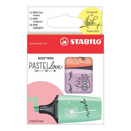 Resaltador BOSS Mini es un resaltador diferente (Menta, Lila, Durazno). Con la tecnología anti secado STABILO: hasta 4 horas de protección. 2 anchos de trazo: 2 + 5 mm, tinta con base al agua