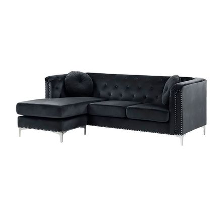 Rediseña la distribución de tu sala de estar con este sofá esquinero. La tapicería de terciopelo, el respaldo capitoné y las patas de metal aportan un toque de glamour al interior. La decoración brillante de los 2 cojines adicionales llama la atención