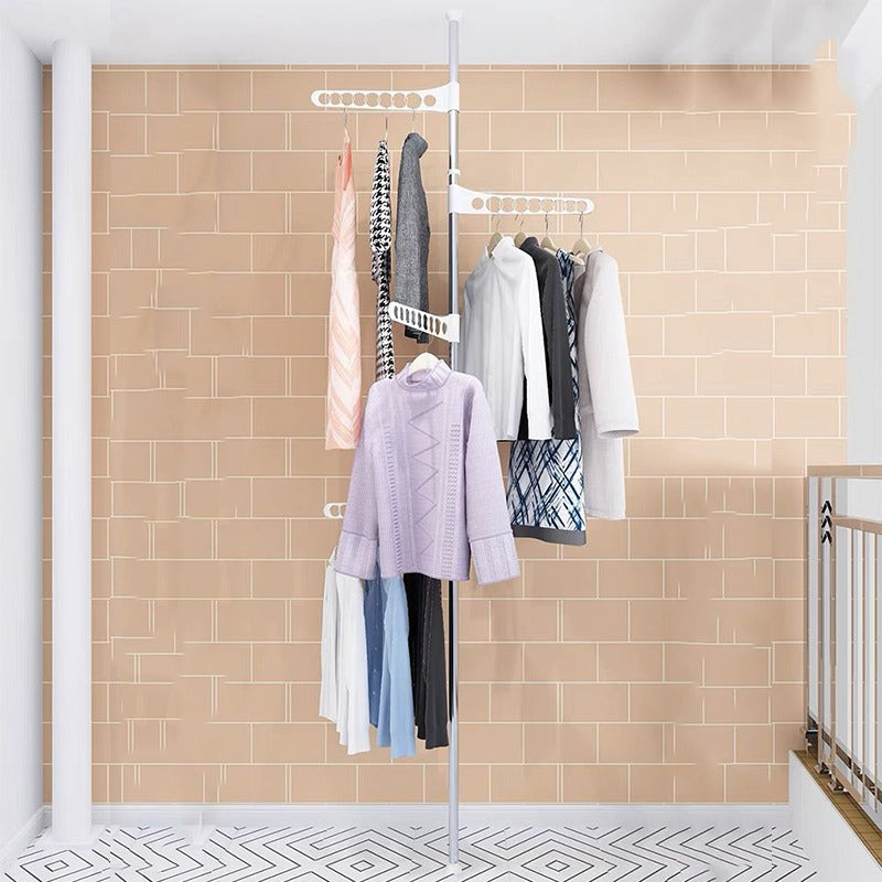 Este producto es de alta calidad. con varillas de acero inoxidable y con una base que no daña el piso y se adapta a cualquier espacio. El tendedero ajustable incluye 4 brazos para colgar ganchos y puedes ajustar la altura hasta en 2.8metros y el espacio entre los brazos ocupando menos espacio en tu hogar.