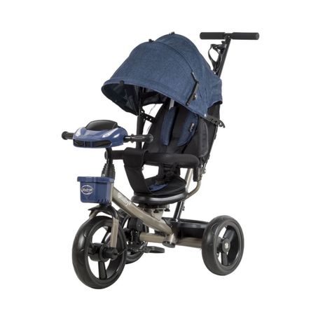 Entrada USB y Bluetooth, Tablero con luz y música, Capota expandible en 3 niveles y desmontable, Cinturón de seguridad de 5 puntos, Guiador con 2 niveles de altura, Reposapiés removible, Asiento giratorio 360 grados, Llantas de plástico, Canastilla delantera y trasera, Barrera protectora desmontable, Uso de 3 pilas tipo doble A (no incluye).